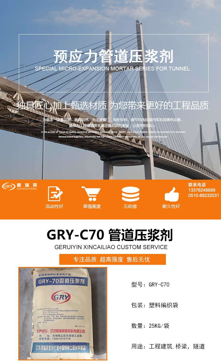 產品簡介:c70 預應力管道壓漿劑 主要性能指標 項目 GRY-C40 GRY-C50 GRY-C60 GRY-C70 GRY-C80 GRY-C90 抗壓強度(MPa) 2h / / / 20 / / 1d 20 25 30 40 / 55 28d 40 65 65 65 80 65 56d 60 65 65 65 80 90 90d 不降低 不降低 不降低 不